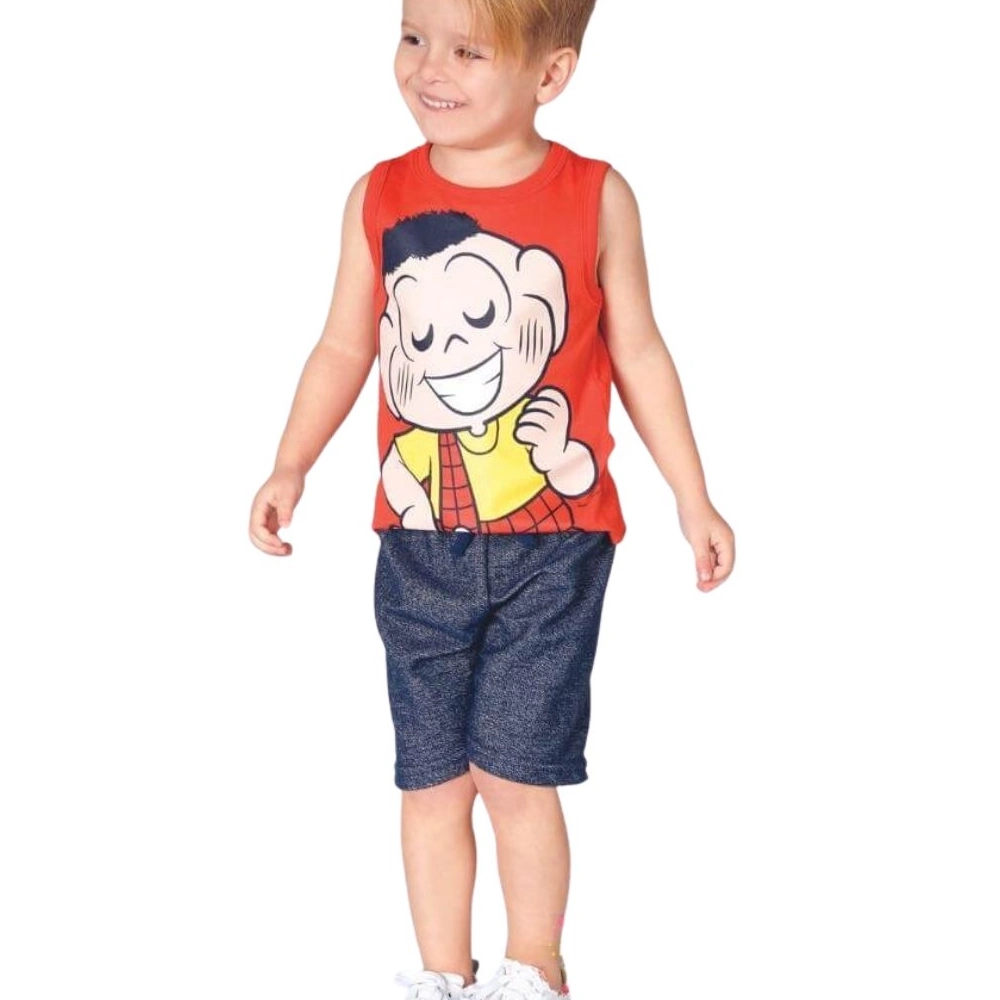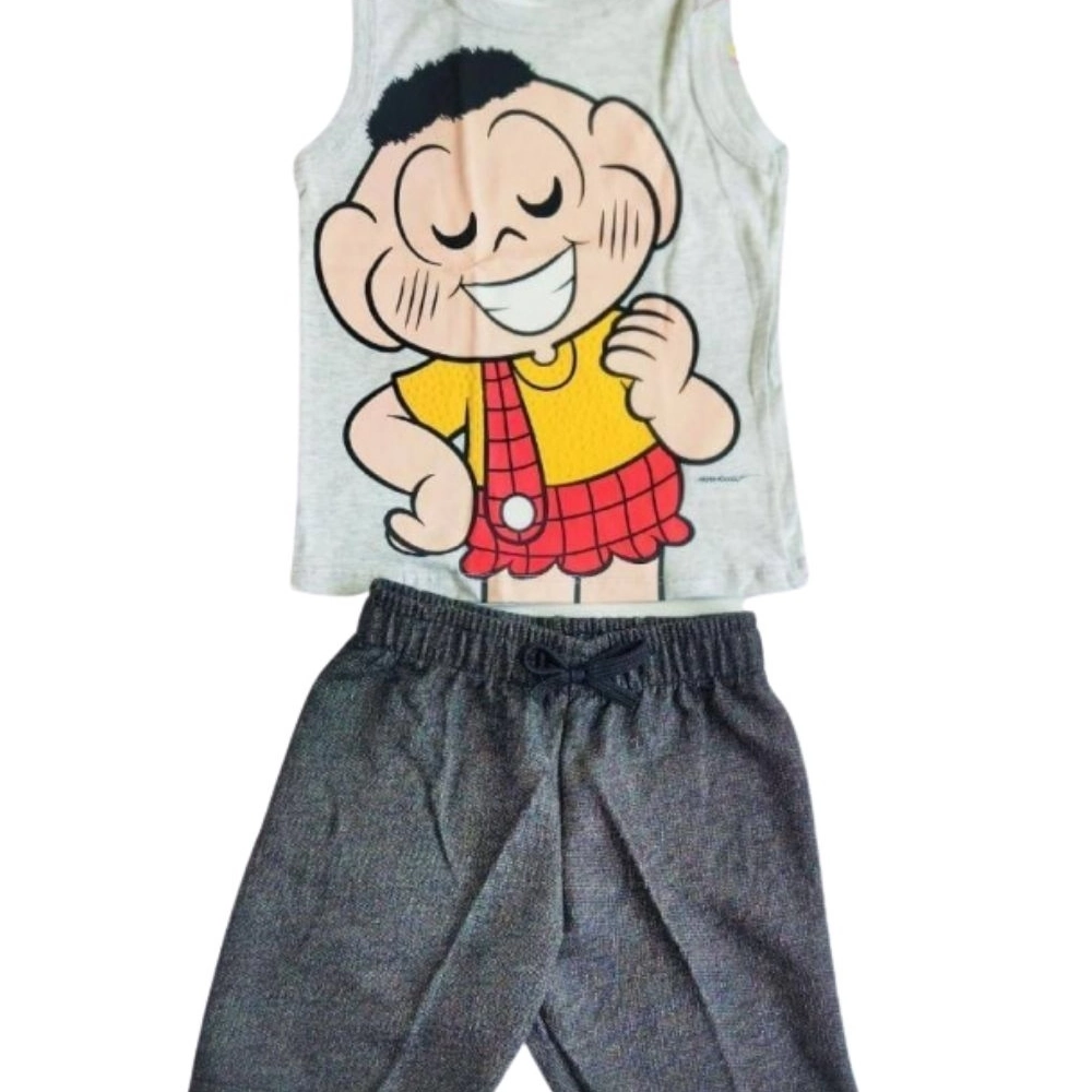 Conjunto confeccionado em meia malha 100% algodão com estampa.
