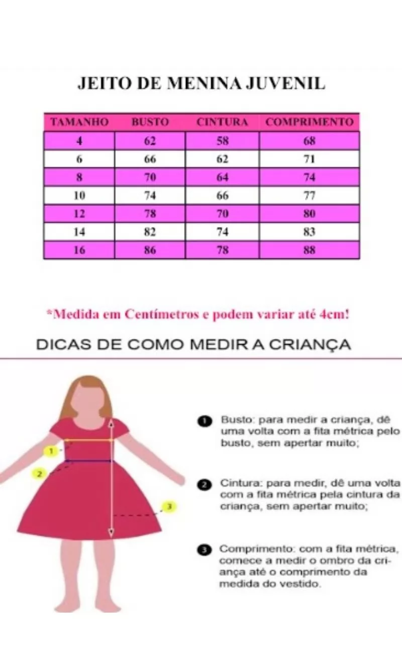 3 - Compare as medidas da Criança com as medidas da tabela que está na descrição, NÃO compre pela idade e sim pelas medidas.