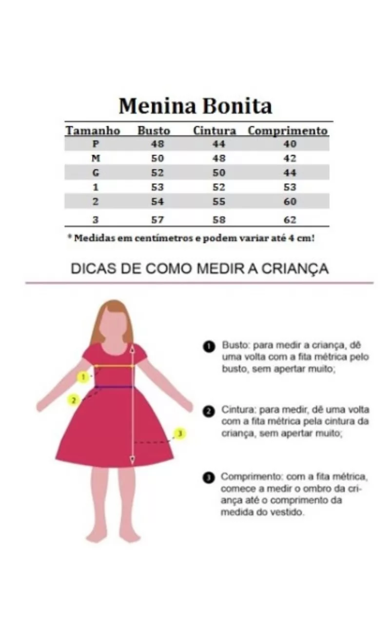 3 - Compare as medidas da Criança com as medidas da tabela que está na descrição, NÃO compre pela idade e sim pelas medidas.